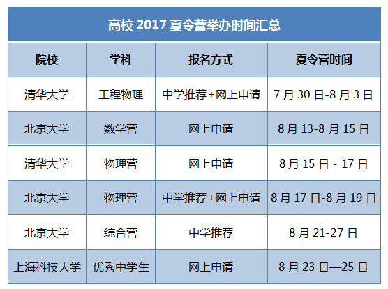 2017年各大高校夏令营报名工作基本结束,8月将陆续开展各种夏令营活动。常规夏令营一般包含专题讲座、相关课题研究、相关测试等等。各校举办时间如下: