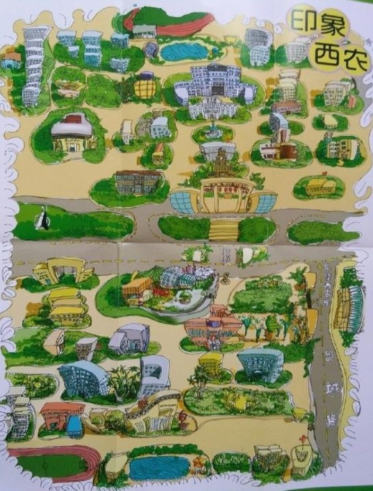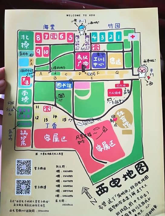封面衬底图纹为老校区主楼前雕塑,封底和内页分别印有西电标志性建筑“观光塔”和“图书馆”,这些都将是西电新生在接下来的四年大学生活中留下痕迹的地方。通知书里面还附有手绘的卡通地图,既能帮助新生更好的了解学校各分区功能,熟悉学校环境,同时又不失趣味性,让新生对大学生活产生向往和无限的期待。