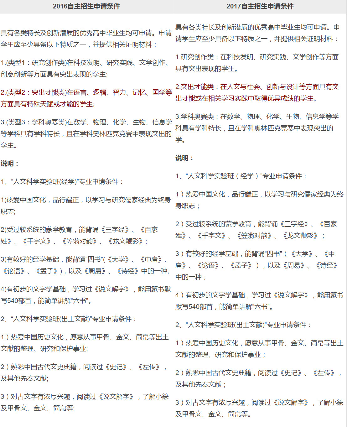 第(2)类条件变化较大,2016年规定为“在语言、逻辑、智力、记忆、国学等方面具有特殊天赋或才能的学生”,2017年则调整为“在人文与社会、创新与设计等方面具有突出才能或在相关学习实践中取得优异成绩的学生”。结合2017年1月份举办的人文社科冬令营、工程科学创新挑战营,不难猜想,这部分调整可能和这些人群有关。