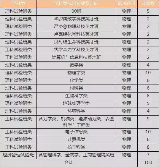 理科试验班类、数学类、物理学类、化学类、材料类、工科试验班、地球物理学类、生物科学类、电子信息类、计算机类、核工程类、环境科学。
