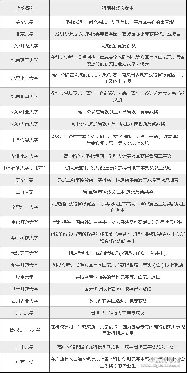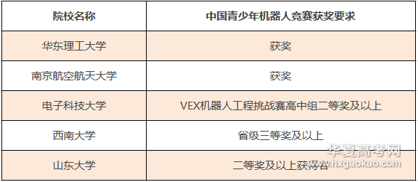此外,其他高校2017年招生简章中,并没有明确对“中国青少年机器人竞赛”奖项有明确要求,但对考生在其他科创类比赛表现有相关要求。2018、2019届考生如在中国青少年机器人竞赛中取得较高奖项,也可尝试报考。