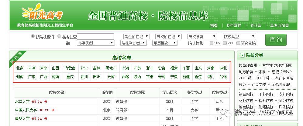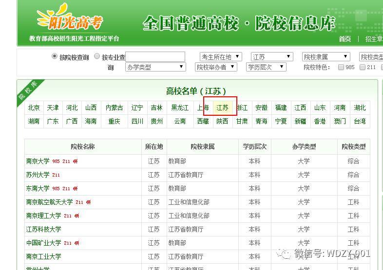B 在院校名单列表上方可以看到全国各省的名称。点击某个省份,比如江苏省,就可以看到江苏省的所有高校名单。点击想查询的大学,就可以进入该大学的页面介绍,获取该大学的基本信息。