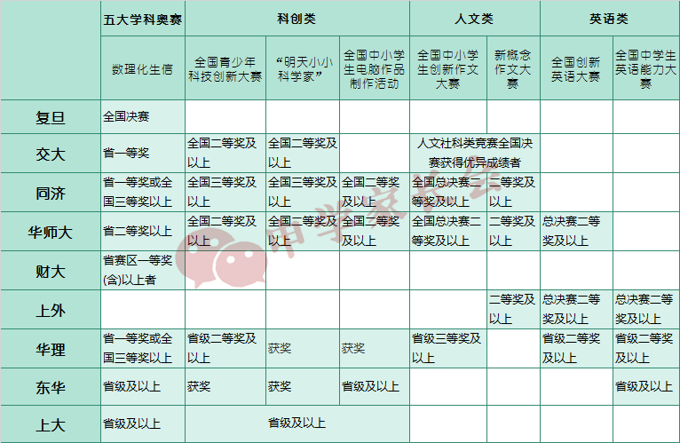 我们不妨来看一下,上海九所高校对一些主流的竞赛,分别有多高的自招门槛。