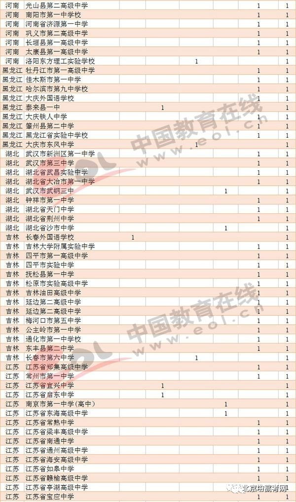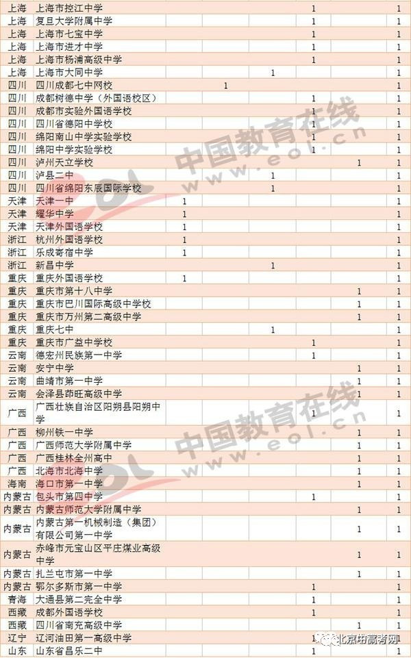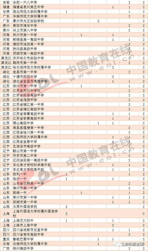 从地区看,生源中学比较多的地区北京28所,河南22所,湖北17所,吉林19所,江苏39所,江西16所,辽宁21所,山东29所,上海13所,四川18所。