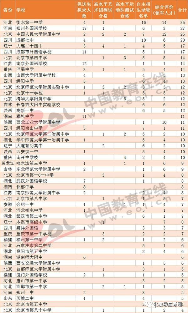 2017年高招工作基本结束,阳光高考网陆续公布了2017年高校各项计划招生名单,清华大学2017年特殊类型招生都来自哪些中学呢?截至8月23日,根据阳光高考网公布的保送生拟录名单、高水平艺术团录取名单、高水平运动队录取名单,自主招生录取名单、综合评价录取名单等几方面数据整理出清华大学2017年生源来自近370所中学。