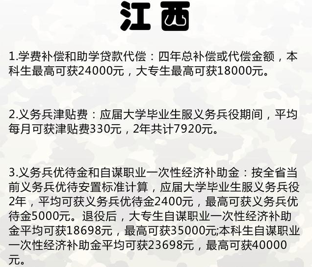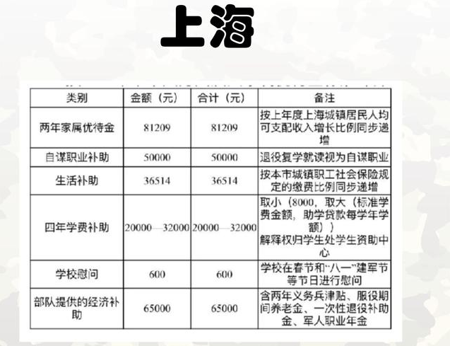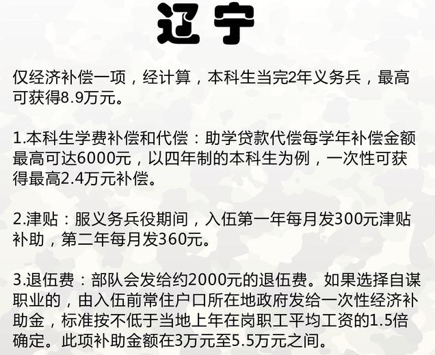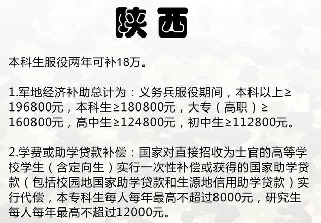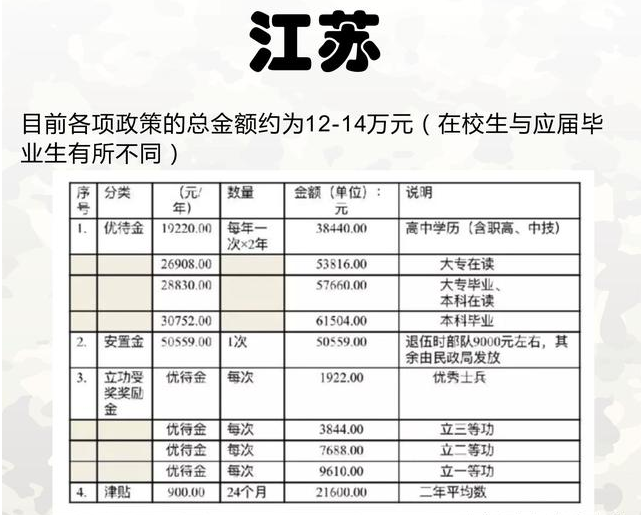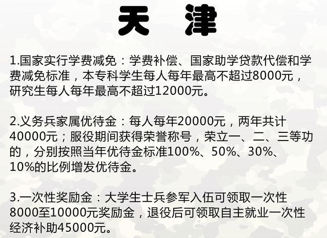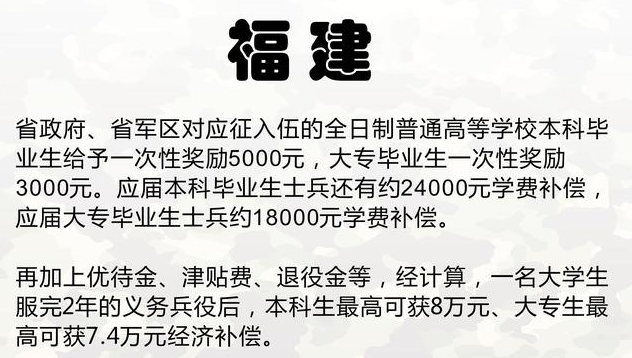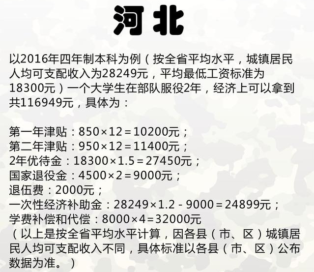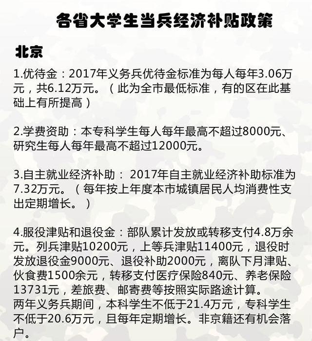 第二是经济账,以城镇在校大学生普通兵为例,首先在基本补助方面,可获得学费补偿、退役金、家庭优待金等。服役期间,每月还可以拿津贴,而且衣、食、住、行、医等开支也全由国家负担,这些加起来也是一笔可观的经济收入,并不比两年直接工作收入低;