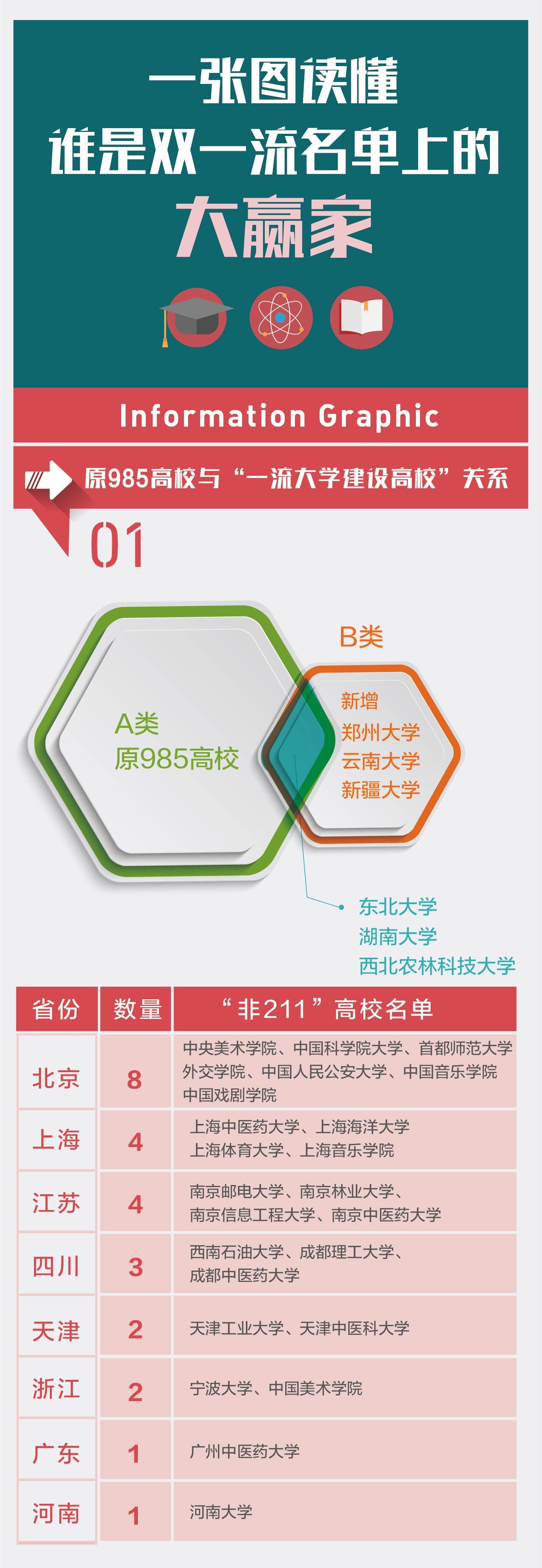 但是,大家却发现,还是那个配方、还是那个味道,同一款软件换了个皮肤。果真如此吗?那么比211要多的这140所高校(包括“一流大学建设”高校42家,“一流学科建设”高校95家,其中中国地质大学(武汉)、中国矿业大学(徐州)、中国石油大学(华东)分为两地办学,一流学科建设也分开),究竟怎么构成?而谁又能成为此轮中国高等教育超级工程最大赢家呢?