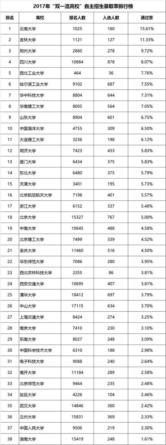 目前,我国有90所高校获得了自主招生资格。在这90所高校中,有36所原985工程高校和54所211工程高校。恰逢双一流名单正式公布,小编对42所世界一流高校2017年自主招生录取情况进行了统计,看一下这些双一流高校的录取比例情况。