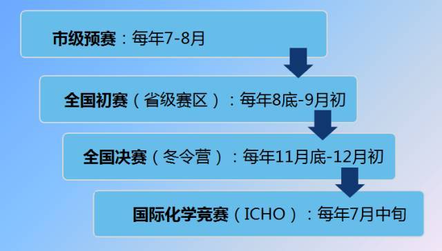 奖项评比情况:化学预赛在各地市学校举行,评选出的奖项分为市一,市二,市三(考核优秀的同学晋级参加化学初赛);化学初赛全省在指定的一个或几个地方进行选拔考试,评选出的奖项分为省一(含省队),省二,省三(考核优秀的同学晋级参加化学决赛(冬令营));化学决赛全国统一指定一个地方进行选拔考核,评选出的奖项分为国一(含集训队),国二,国三(考核优秀的同学晋级参加集训队训练,最终选出5名优秀选手代表中国参加IChO);IChO全世界在指定的一个地方进行选拔考核,评选出国际金牌,国际银牌,国际铜牌。