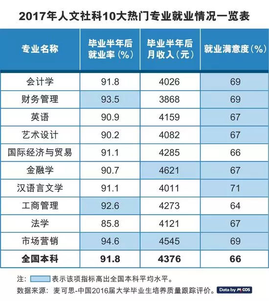 报告显示,汉语言文学专业就业满意度最高,为71%。除此之外,市场营销、会计学、财务管理三个专业的就业满意度均为69%,并列第二。值得注意的是,文科十大热门本科专业的就业满意度普遍较高,有八个专业高于全国本科平均水平。