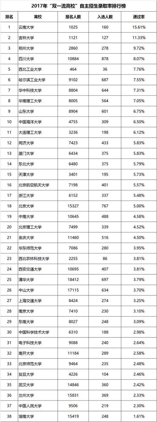 通过上表可以看出:2017年自主招生录取比例最高的三所高校分别是云南大学、吉林大学和郑州大学。