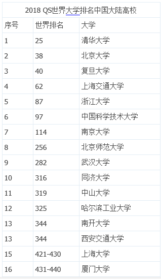 QS世界大学排名是由教育组织Quacquarelli Symonds所发表的年度世界大学排名,是历史第二悠久的全球大学排名,以下是跻身QS2018年世界大学排名的高校名单。
