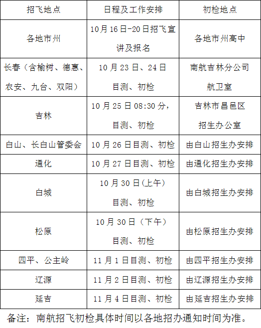 中国南方航空股份有限公司2018年拟在吉林面向高三学生招收本科飞行学员,具体初检安排如下(以下时间为2017年):