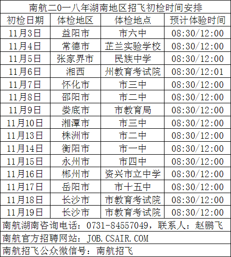 中国南方航空股份有限公司2018年拟在湖南面向高三学生招收本科飞行学员,具体初检安排如下(以下时间为2017年):
