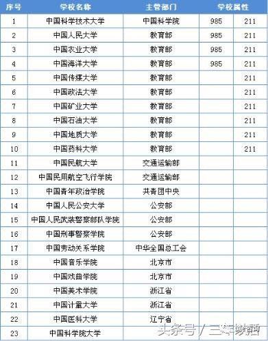目前我国内地冠以“中国”的高校有23所,这些学校中有4所是985工程大学,10所是211工程大学,9所是教育部直属高校,3所是公安部直属高校,2所是交通运输部直属高校。