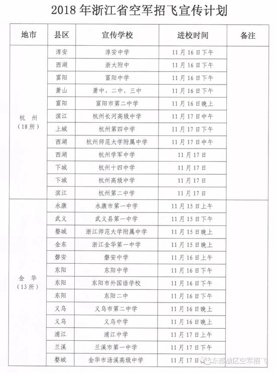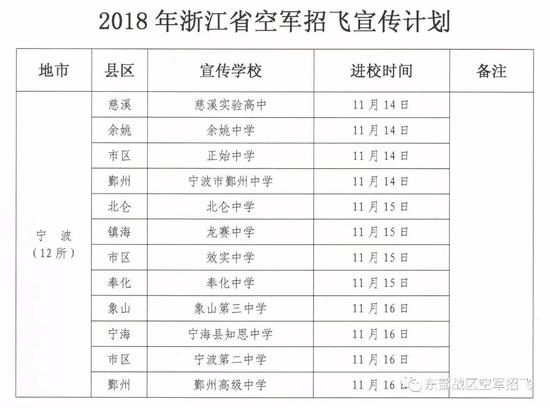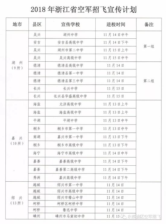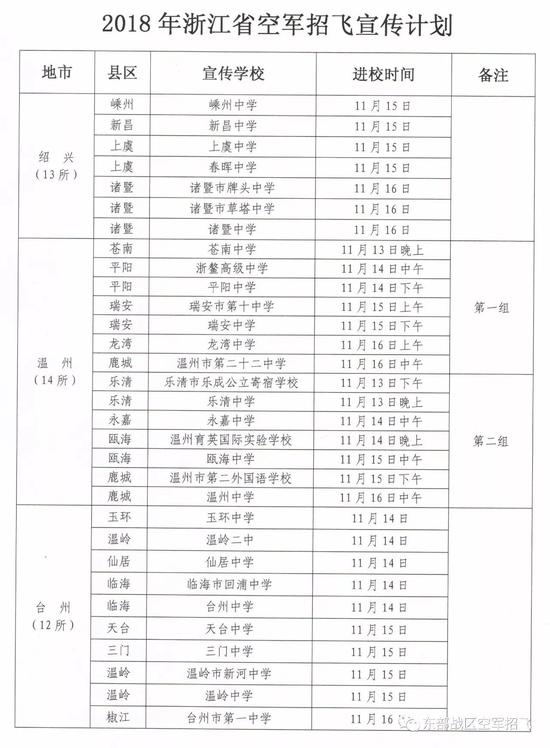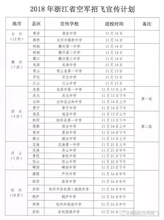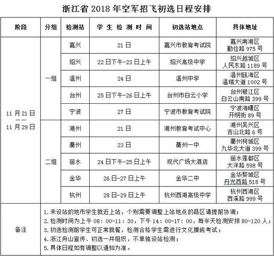 浙江省2018年空军招飞进校宣传、初选检测安排如下表。如有变动,以各地市教育招生部门和学校通知为准。咨询电话025—80875437。