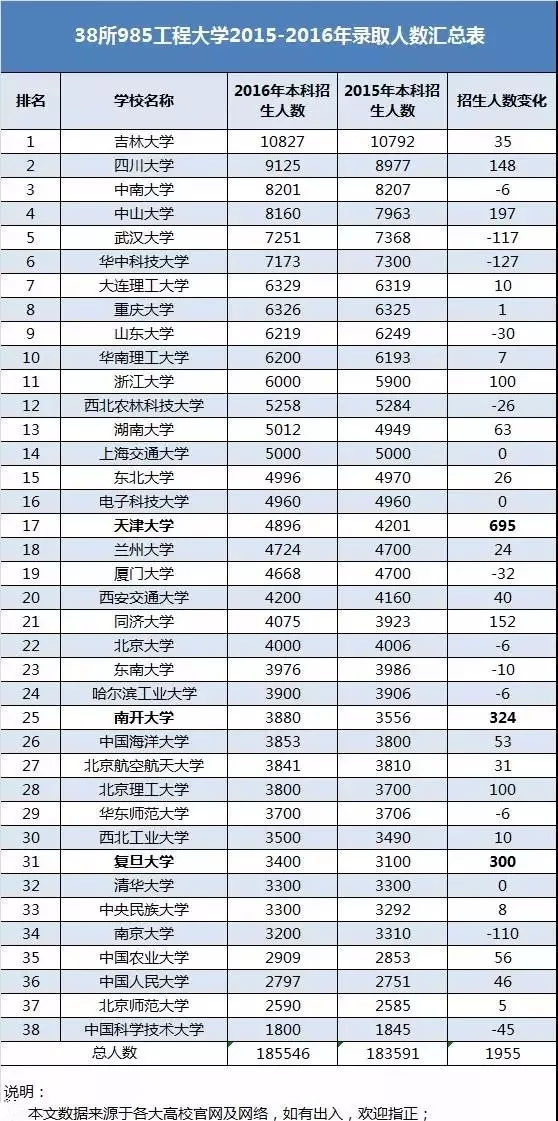 本文对38所985工程大学(除国防科技大学,由于国防科大的招生不属于教育部管)的2015年-2016年的录取人数进行了采集,供参考!