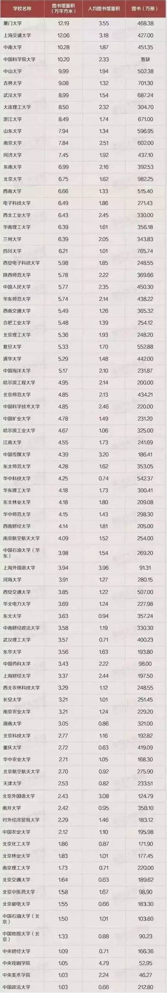 排名首位的厦门大学图书馆,面积达12.19万平方米,相当于17个标准足球场的大小,此外,人均图书馆面积也是遥遥领先,达3.55平方米,阅览座位11000个,座位数与学生数的比例为3:1,这就意味着厦大的学生完全没有期末抢座占座的烦恼~