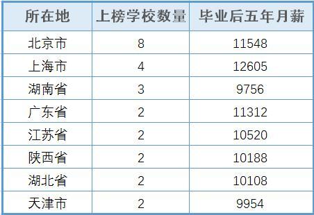 统计后发现,其中北京、上海、湖南分布的双一流大学最为密集,北京有8所大学,分别为清华、北大、人大、北航、北理工、北师范、中央民族大学和中国农业大学;上海有4所大学,分别为上交、复旦、统计、华东师范大学;湖南有3所大学,分别为国防科学技术大学、湖南大学和中南大学。同时,可以看到,地区对于毕业薪酬的影响很大。因为处于经济发达地带,上海的薪酬平均值达到了12605,为所有地区最高。
