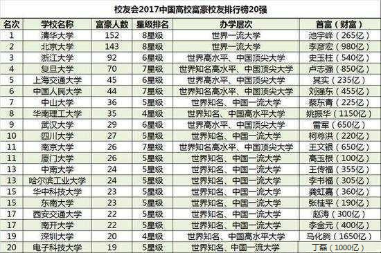 为什么要上名校?在名校,我们可以接收到最先进、精深的学问和技术,锤炼本身的硬件。更能够接触更多有梦想、有实力的大咖,扩展眼界和人脉,奠基自己的软件。这些都是普通高校难以企及的。如果您想上名校,可以参考以下20所高校。因为,他们是中国最能出富豪的大学。