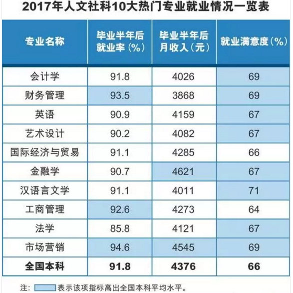 报告显示,汉语言文学专业就业满意度最高,为71%。除此之外,市场营销、会计学、财务管理三个专业的就业满意度均为69%,并列第二。值得注意的是,文科十大热门本科专业的就业满意度普遍较高,有八个专业高于全国本科平均水平。