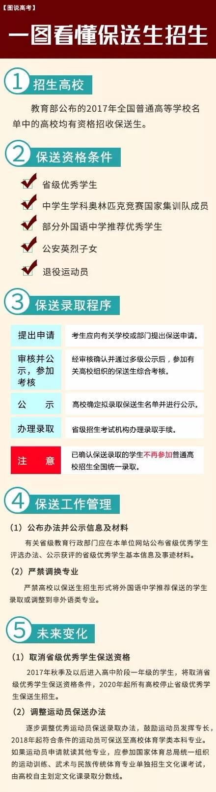 五、高校要将已测试合格拟录取的保送生数据库上传至教育部阳光高考信息平台(http://gaokao.chsi.com.cn/)。有关生源所在省级招办随后在网上审核确认后下载数据并办理录取手续,再将保送生录取名册寄至相关高校。经省级招办审核录取的保送生不再参加普通高校招生全国统一录取。