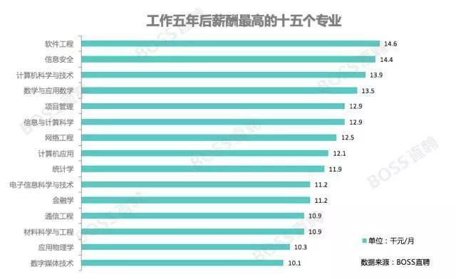 根据BOSS直聘公布的数据信息显示,这15个专业工作五年后平均月薪最高,软件工程成为月薪最高的专业,平均月薪14600;紧随其后的是同计算机类的信息安全与计算机科学与技术,平均月薪是14400、13900;一直被认为就业不好,报考遇冷的应用物理学专业,也挤进该排行榜,成为平均月薪过万的学科。下面就详细介绍,仅供参考。