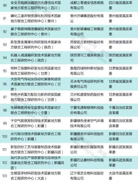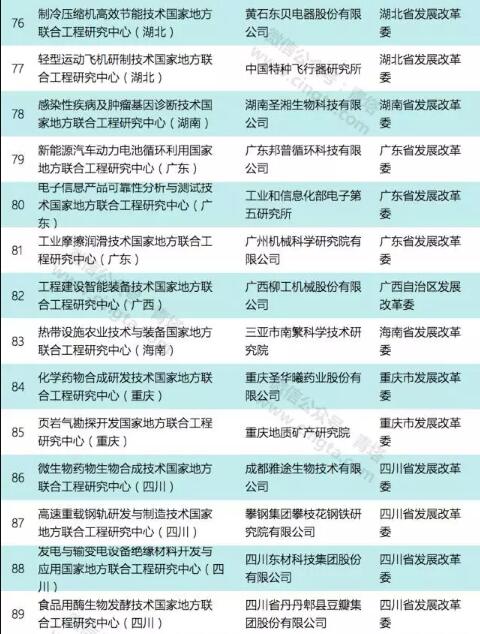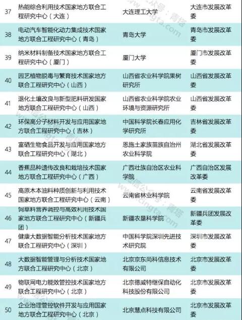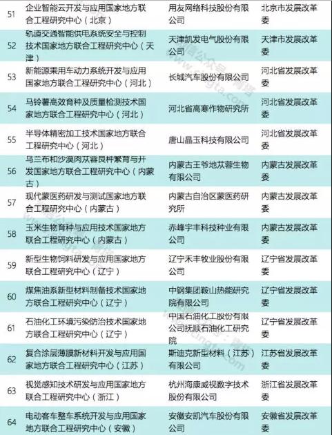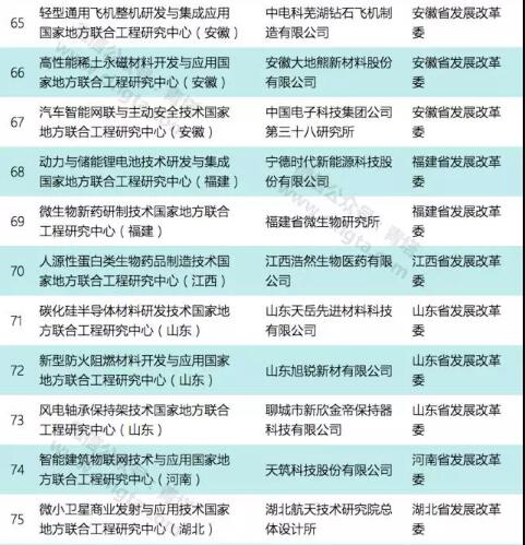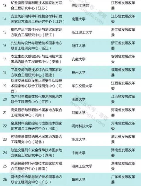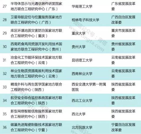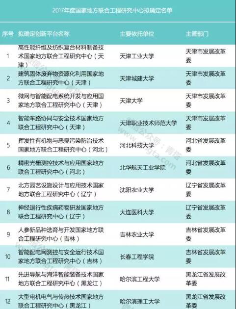 本次公示的国家地方联合工程研究中心(工程实验室)共有111个,其中依托高校的共有39个,包括浙江大学、天津大学、中南大学、重庆大学、西安交通大学、西北工业大学、西北大学、大连理工大学、厦门大学等重点高校和一批地方强校。2017年国家地方联合工程研究中心拟确定详细名单如下: