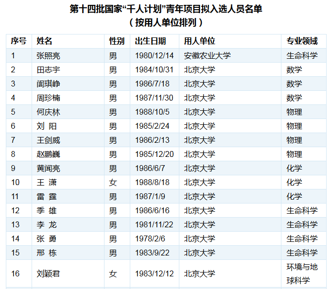 12月4日上午,千人计划网公示了第十四批国家“千人计划”青年项目拟入选人员名单。第十四批国家“千人计划”青年项目申报3556人,经形式审查、通信和面试评审,630人通过终审,拟予引进。