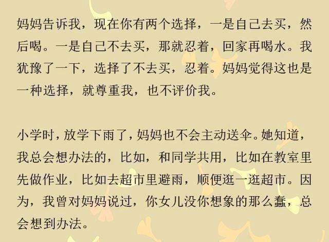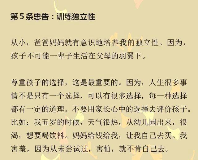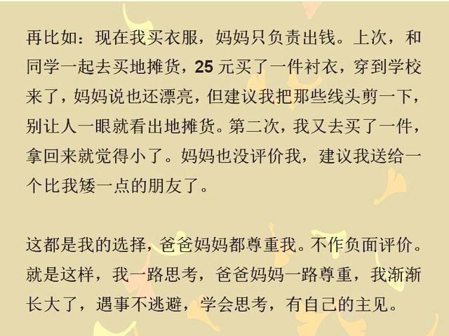 随着孩子的成长,给他越来越多的自由和控制自己生活的权力是很重要的。必须有意识地要求自己;甚至是克制自己的那种什么事都为孩子做的想法,来给孩子一些自由度。给孩子一定的自由,表明我们信任和尊重孩子,孩子也会因此更加尊重我们,爱我们。