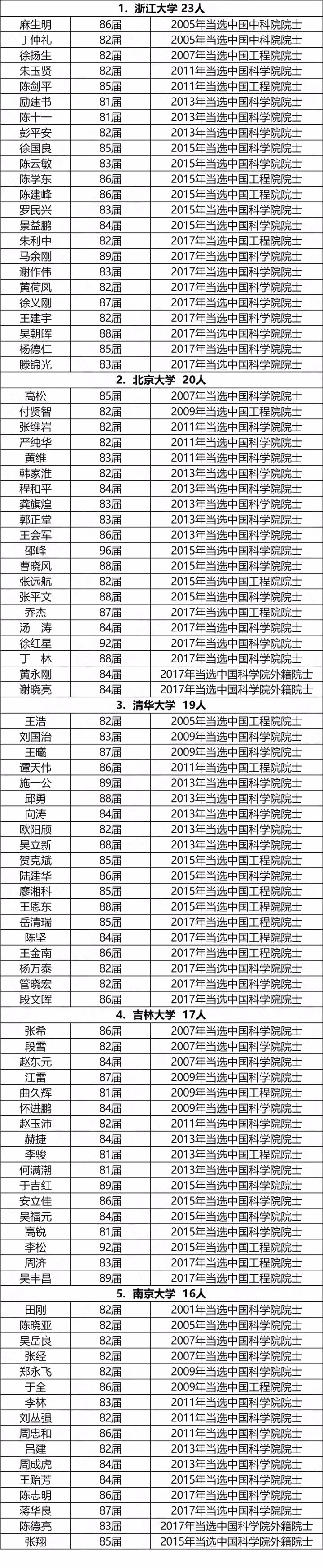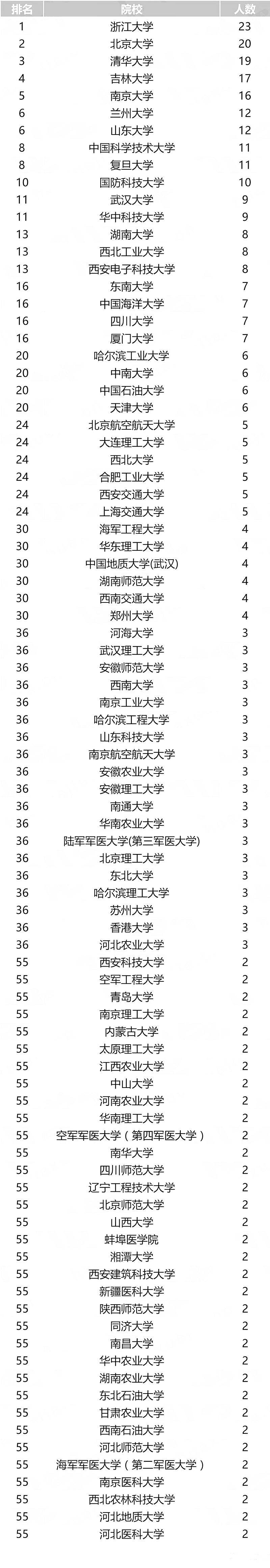 从统计数量来看,自1977年恢复高考40年以来,浙江大学共有23位,位居各大高校首位。北京大学以20名本科毕业生当选两院院士排名第2。清华大学以拥有19名本科毕业生当选两院院士位居第3,吉林大学17位本科生校友位居第4,南京大学16位本科生校友位居第5,兰州大学和山东大学各有12人并列第6,中国科学技术大学和复旦大学各有11人并列第8,国防科技大学、武汉大学、华中科技大学、湖南大学、西北工业大学、西安电子科技大学等高校也有不错的表现。