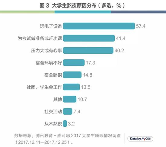 正值期末备考期,又到了大学生们突击复习、熬夜备考的时候。“晚上不睡、早上不起”“越睡越晚”已经成为众多大学生的通病,网络上甚至出现了“熬夜修仙”的流行语。大学生的睡眠状况究竟如何?哪些因素影响了大学生的睡眠质量?“腾讯教育-麦可思2017大学生睡眠情况调查”旨在通过相关问题,了解大学生的实际睡眠情况。分析内容如下: