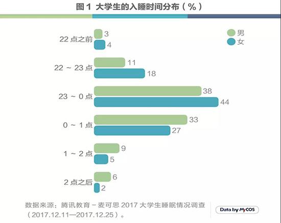 另据腾讯教育-麦可思2017大学生睡眠情况调查数据显示,七成大学生的入睡时间集中在23点到凌晨1点之间,41%的大学生入睡时间在零点以后。男生更爱熬夜,零点以后入睡比例(48%)高出女生14个百分点。