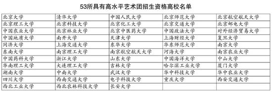 2018年,经教育部批准可在全国招收高水平艺术团的高校有53所。