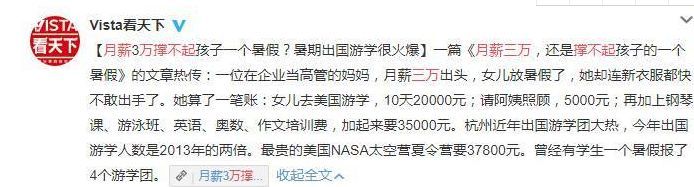 曾在微信朋友圈热传的文章《月薪三万,还是撑不起孩子的一个暑假》中月薪3万的高管妈妈,就曾倒出了他的苦楚:“女儿去一趟美国游学,10天20000元,女儿平时在家需要请阿姨照顾,5000元;7月份钢琴考级,每周要上两节钢琴课,200元一节,一共2000元;游泳班2000元;英语、奥数、作文3科培训班6000元,这么几项加起来就要35000元了。“痛苦的是你花了,心疼得不踏实;不花吧,对不起孩子更不踏实!”