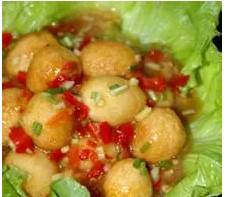 2、锅中放油烧热,将剥好皮的鹌鹑蛋炸至表皮金黄色后,捞出沥油;