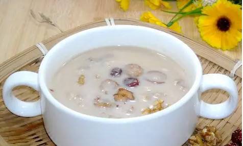 将核桃仁放在温水中浸5分钟后去皮,用小石磨带水磨成汁(也可用小石臼捣烂),用纱布过滤,使核桃汁流入锅中,加进白糖,清水500克,煮至水沸,即可出锅食用。此羹热饮冷饮无可,如加些杏仁汁同煮,香味更浓。