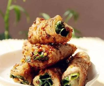 3:锅热后倒入一点点油,放入肉卷煎,待一面煎的有点焦后换一面接着煎(四面都煎一下),待肉卷都煎好后取下牙签,把调好的孜然粉用刷子刷上去,使之每一面都有味道。