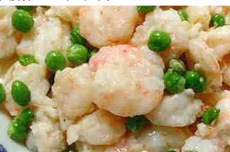 鲜碗豆50克,虾仁150克,豌豆苗200克,蛋清1个,碱面、淀粉、精盐、胡椒粉、味精、绍酒、葱末、姜末等。