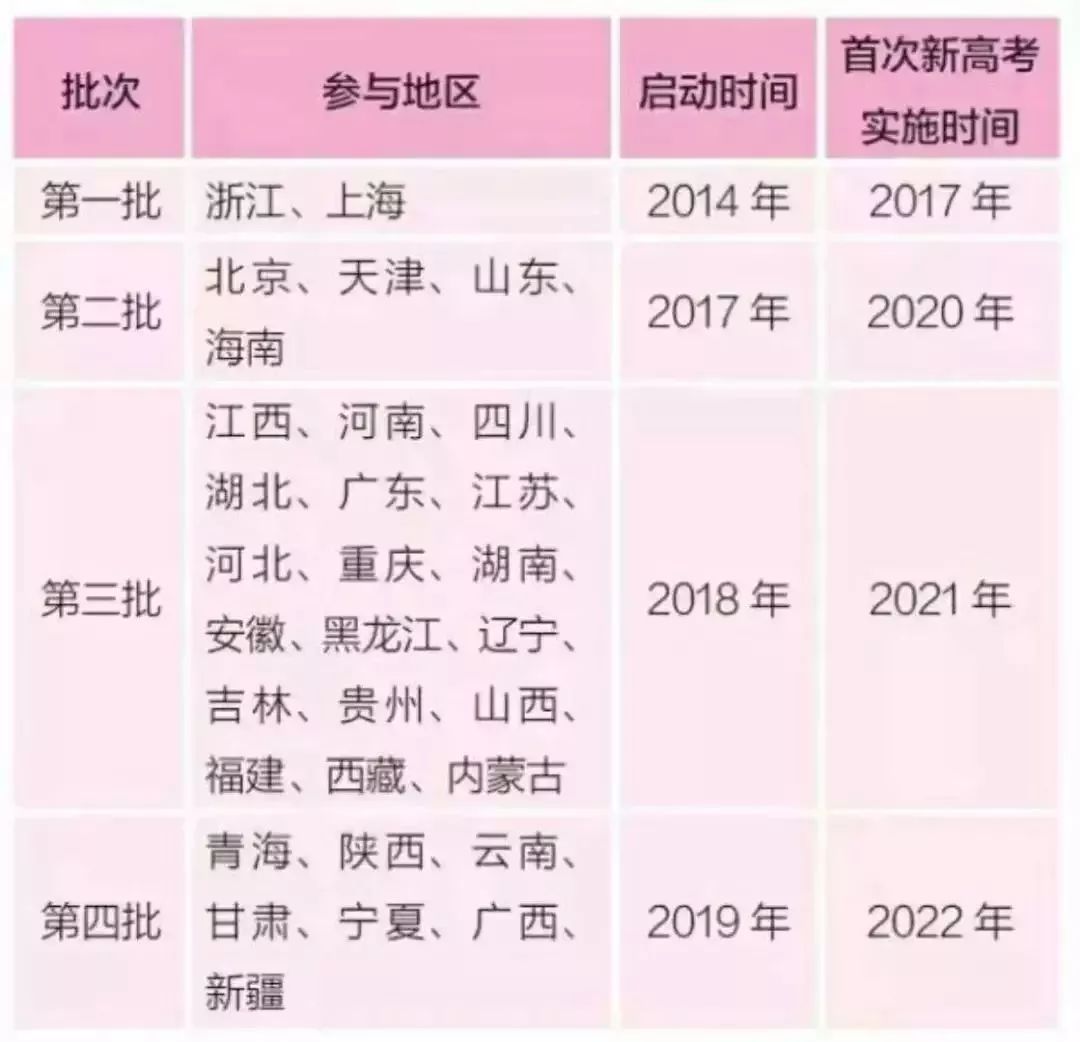 由于采用的是各地根据自身条件逐步参与施行的方式,所以不同地区的同学参加新高考的时间有所不同,具体可以参见上表。