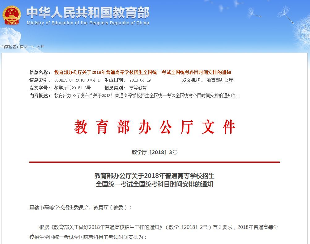 近日,教育部办公厅发布《关于2018年普通高等学校招生全国统一考试全国统考科目时间安排的通知》,通知公布了2018年高考全国统考科目的考试时间安排,并要求各省(区、市)考试科目名称与全国统考科目名称相同的必须与全国统考时间安排一致。
