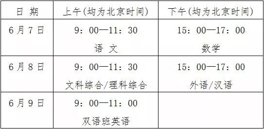 根据《教育部关于做好2018年普通高校招生工作的通知》(教学〔2018〕2号)有关要求,2018年普通高等学校招生全国统一考试全国统考科目的考试时间安排为: