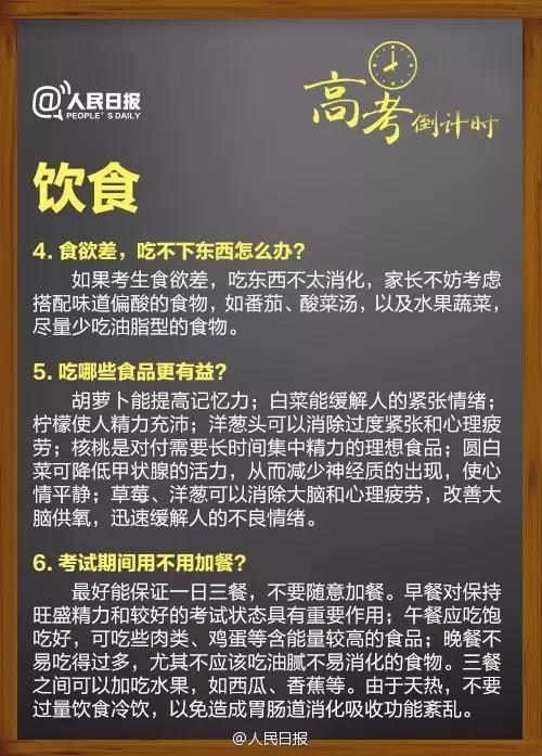 考生食欲差,家长不妨考虑搭配番茄、酸菜汤以及水果蔬菜,尽量少吃油脂型的食物。不要随意加餐,以免造成肠胃消化吸收功能紊乱。