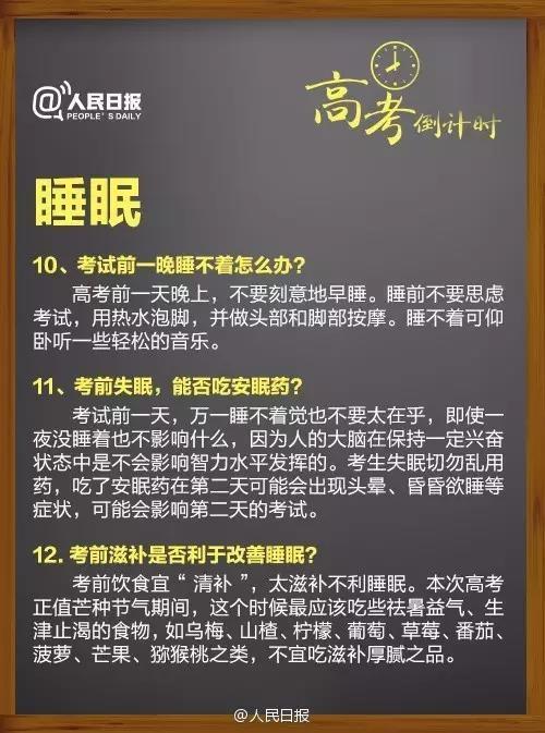 考前睡不着可以用热水泡脚,放一些舒缓的音乐来催眠,切记不能让大脑太兴奋,就算睡不着也要闭目养神。