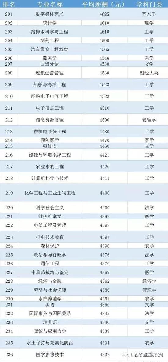 剩下的专业薪酬排名,9000元以上的专业共有5个,7000元以上的专业共有20个,反而百来个专业的平均薪酬都集中在4000~6000元。可见,各大专业毕业生的平均薪酬几乎在这个区间上下浮动,你在平均值上,还是下呢?不妨来看看“2017中国236个专业平均薪酬大排行”。