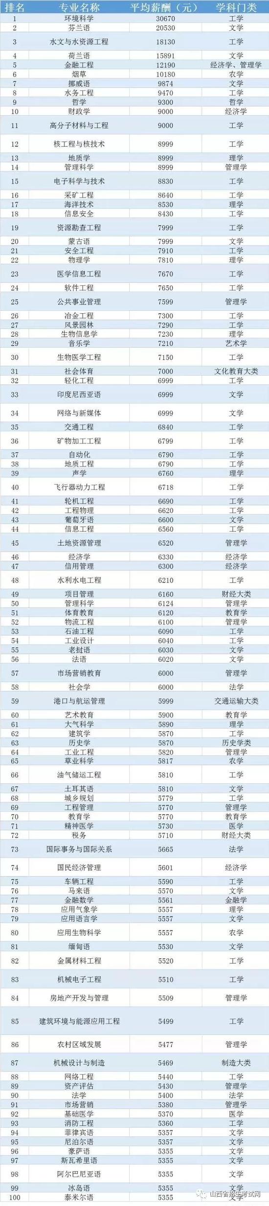 榜单中上万的大学专业只有六个。并且平均薪酬最高的不是计算机,也不是信息安全,反而是冷门专业:环境科学,唯一一个平均薪酬达到3万元的榜首专业。