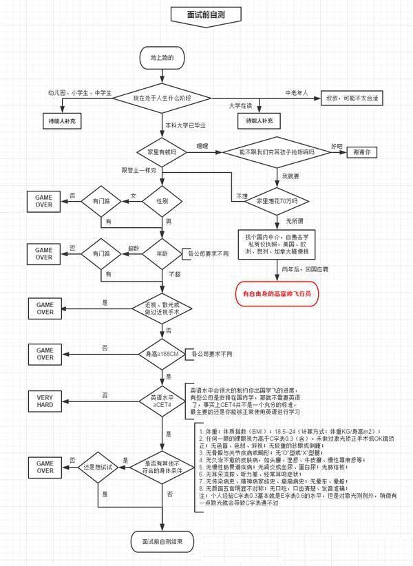 而学员在校期间,除了完成大学的相应课程,还需要8种飞行员任职资格证书。--这就是一般大学生就业飞行员的途径。下面,小编搜集了一个【招飞前自测思维导图】,想要当飞行员的同学可以根据自己的情况,自我检测一下。