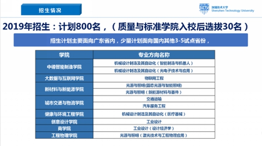 会上,教务部兼招生办主任刘宏伟对深技大今年招生政策做了解读,今年学校招生计划主要面向广东省内,少量计划面向国内其他3至5个试点省份。此前,深圳技术大学于2017、2018年分别依托深圳大学招收226名及807名全日制本科生;2018年11月30日,深圳技术大学获教育部发函正式成立,于2019年进行首年独立招生。