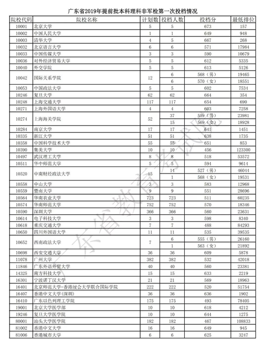 广东省2019年提前批本科理科非军检第一次投档情况