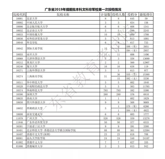 广东省2019年提前批本科文科非军检第一次投档情况